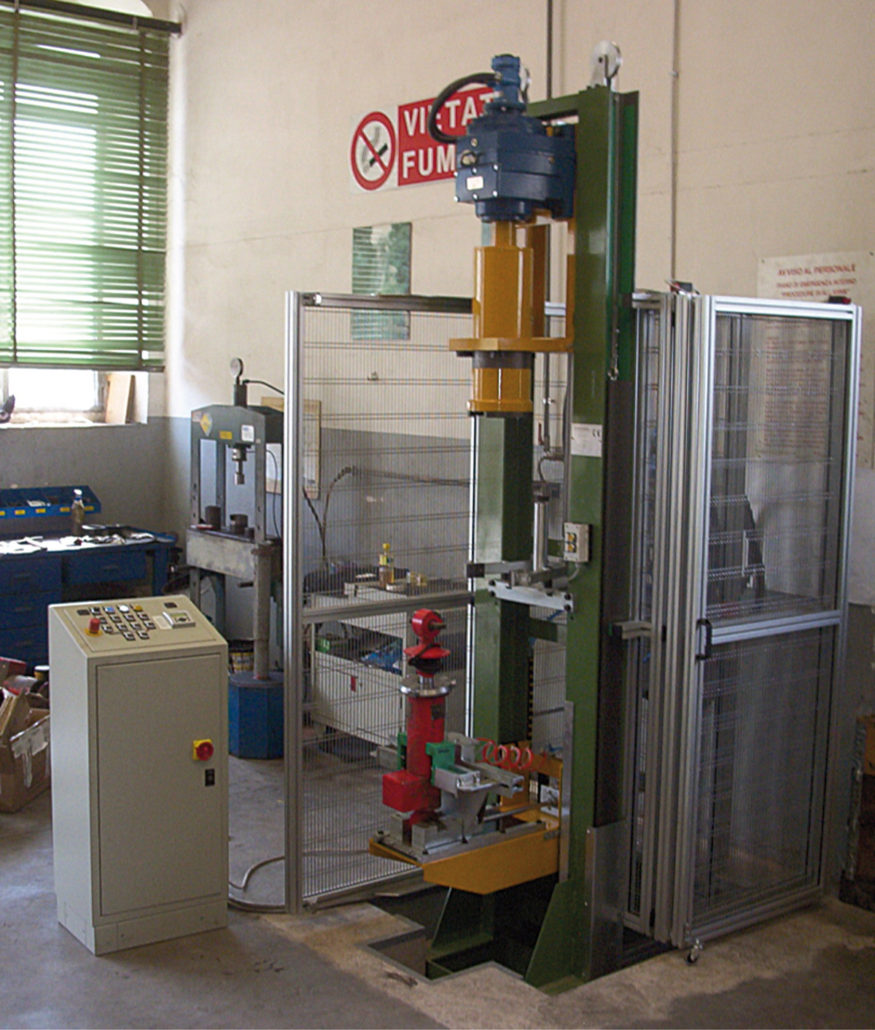 La stazione di revisione per ammortizzatori antiserpeggio di carrelli ferroviari è costituita sostanzialmente da un sistema di avvitatura e svitatura delle n.2 ghiere disposte a chiusura e bloccaggio degli organi meccanici interni; poiché anche la coppia di serraggio delle ghiere è variabile in relazione al tipo/modello di ammortizzatore, la macchina è dotata di un impianto pneumatico del gruppo di avvitatura con valvola proporzionale, che consente di assegnare da pannello comandi la pressione corrispondente alla coppia richiesta.